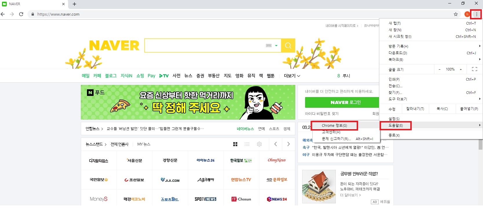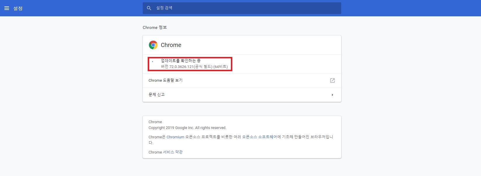 구글 크롬 업데이트를 하기 위해서는 오른쪽 메뉴를 클릭한 후 [도움말]-[Chrome 정보]를 클릭해주세요.