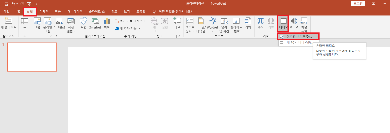 파워포인트를 열어서 [삽입]-[비디오]-[온라인비디오]를 클릭해주세요.