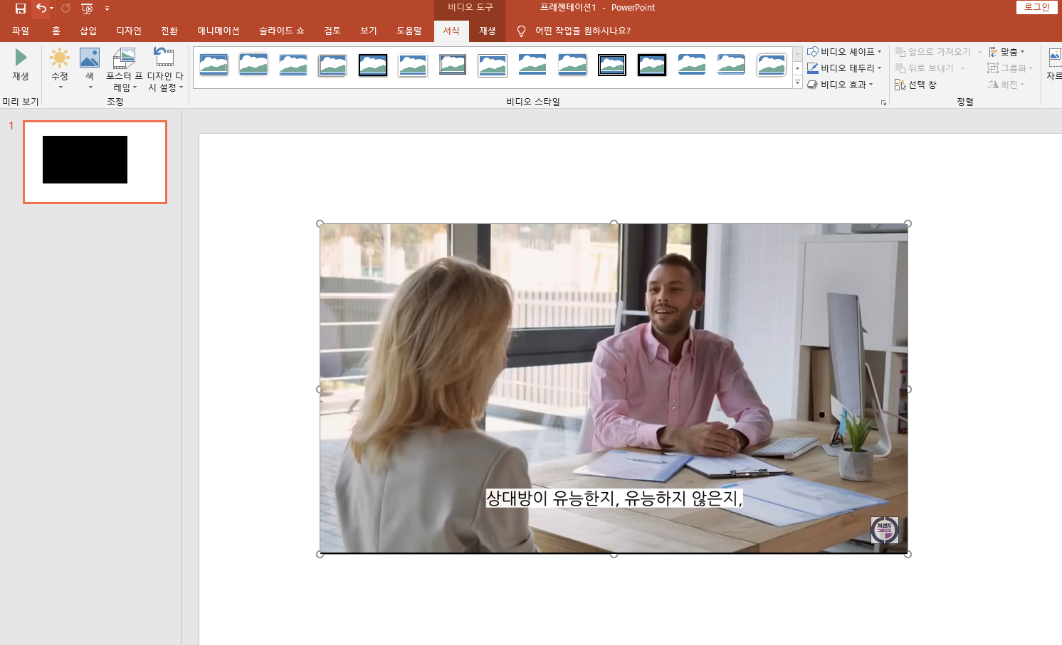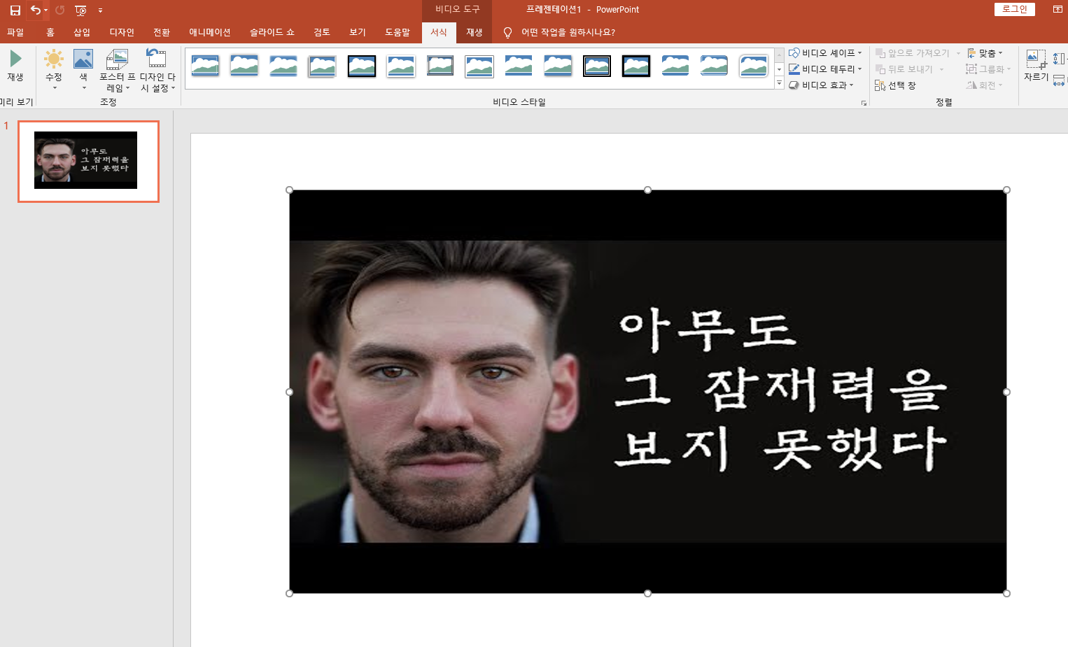 그럼 아래 처럼 유튜브 동영상이 슬라이드에 넣어진 것을 확인 할 수 있습니다. 원하는 사이즈나 위치에 맞춰서 넣어주시면 됩니다.