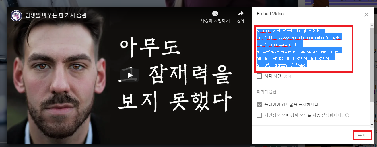 아래에 Embed Video 창을 보실 수 있어요. iframe 코드를 선택해서 복사를 클릭해주세요. 아래 시작시간 체크박스를 클릭해서 시작시간을 설정할 수도 있습니다.