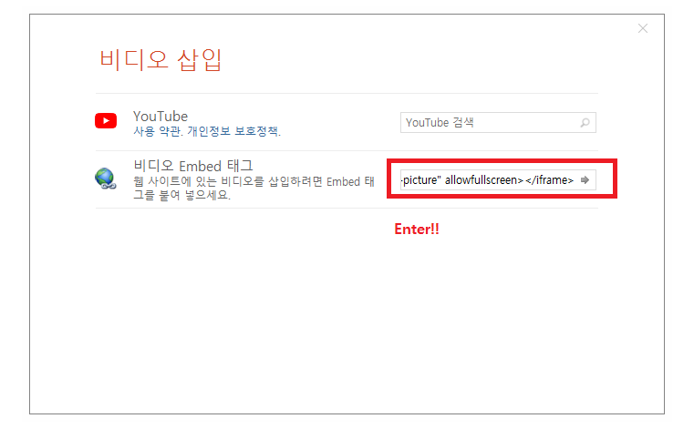 비디오 Embed 태그 오른쪽 텍스트 박스에 아까 복사한 코드를 붙여넣기 한 다음에 엔터키를 눌러주시면 됩니다.
