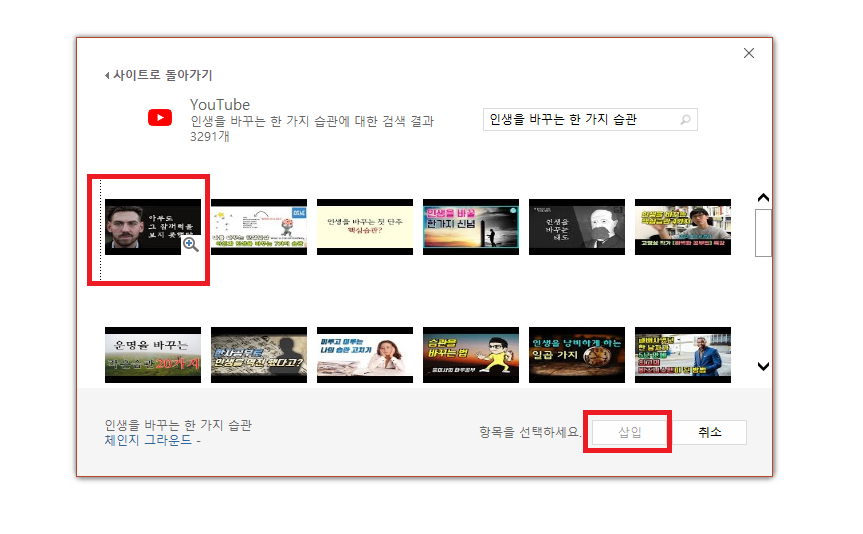 아래 검색된 동영상 중에 원하는 영상을 클릭한 다음 삽입을 클릭하면 끝이납니다.