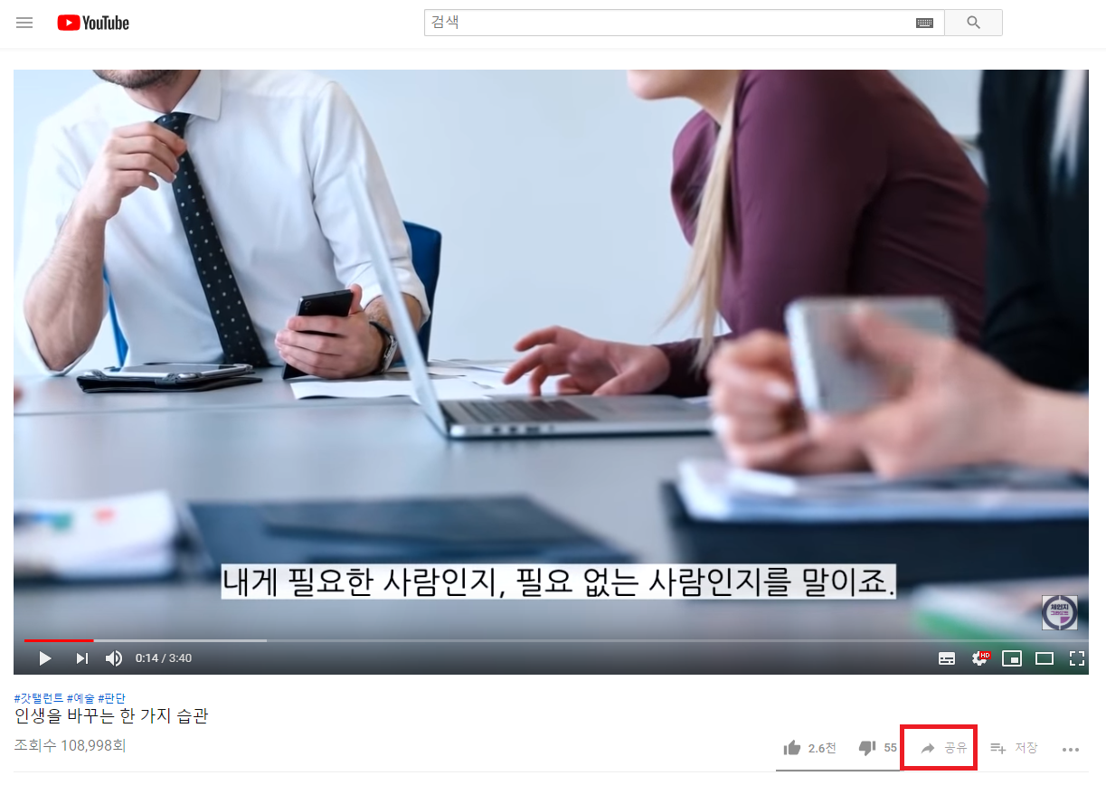 먼저 넣고자하는 유튜브 영상을 찾아서 영상 페이지에 들어가주세요. 아래쪽 하단에 보면 공유 버튼이 있습니다. 공유 버튼을 클릭해주세요.