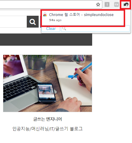 확장프로그램 설치를 완료하면 아래와 같이 주소창 옆에 표시가 나타나고 클릭하면 이전에 닫았던 탭의 내역을 볼 수 있습니다.