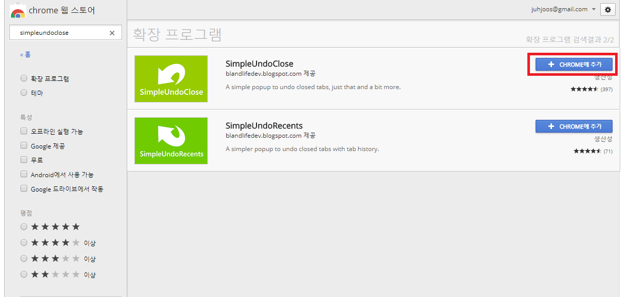 크롬 웹스토어에 들어가신 후 SimpleUndoClose를 검색 한 다음 CHROME에 추가를 선택하면 확장프로그램 설정이 완료됩니다.
