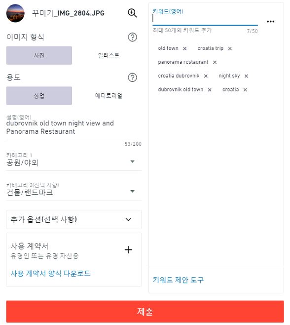사진을 올린 다음에 설명과 키워드(7개 이상)을 입력하고 카테고리를 설정해 줘야합니다. 간단하게 작성해 보았어요.
