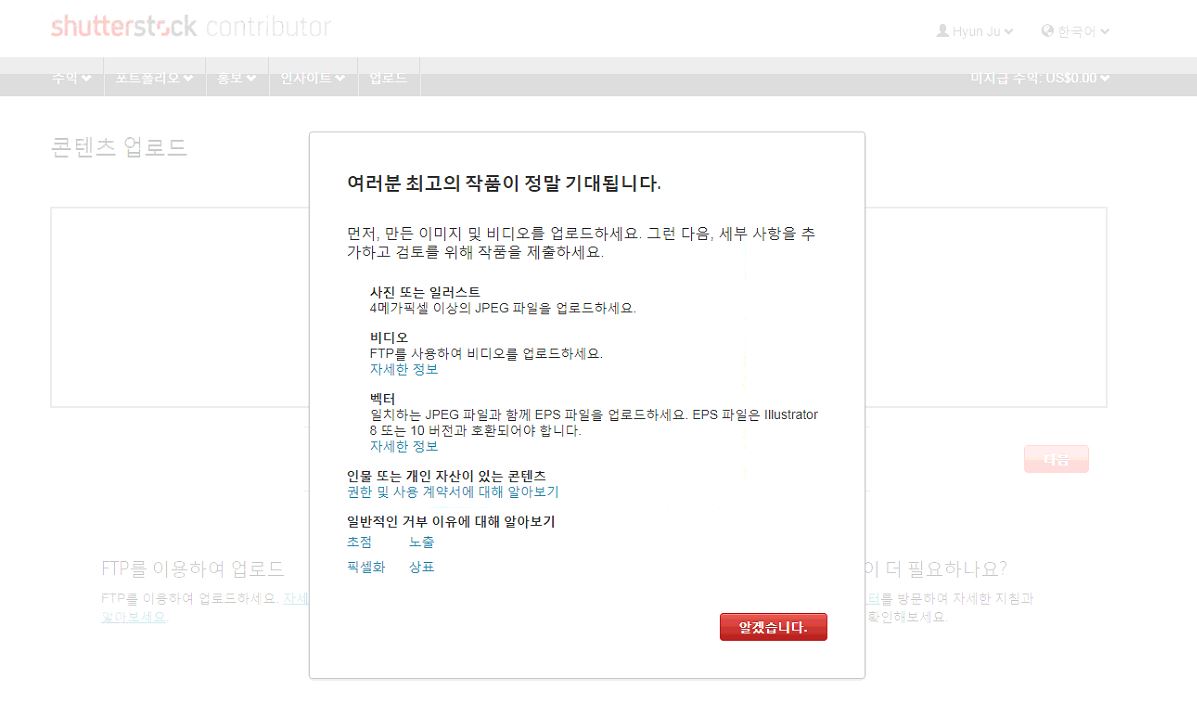 이제 가입이 끝났습니다. 지금부터 사진을 올릴 수 있어요. 사진은 4메가픽셀 이상의 JPEG 파일을 업로드 하라고 하네요. 아무래도 좋은 화질의 고해상도 사진을 선호하는거 같습니다. 이번에 크로아티에서 찍은 사진을 바로 업로드 해보았습니다.
