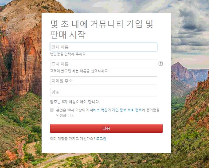 시작하기를 클릭하여 가입을 시작합니다. 가입을 위해 이름과 이메일 주소 그리고 비밀번호를 입력하고 다음을 클릭해주세요.