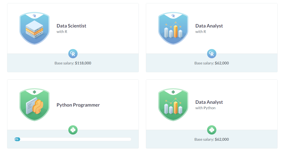 제가 지금 하고 있는 Data Scientist with Python 과정 외에도 R Programmer, Data Analyst with Python 등 다양한 직업 과정이 있기 때문에 많은 것을 배워 갈 수 있습니다.