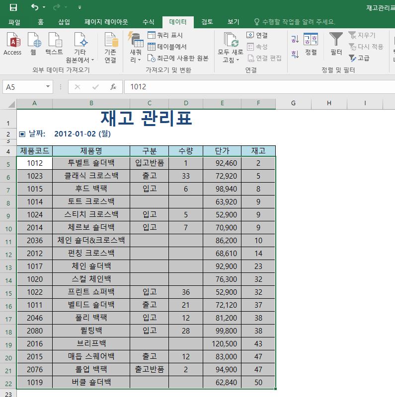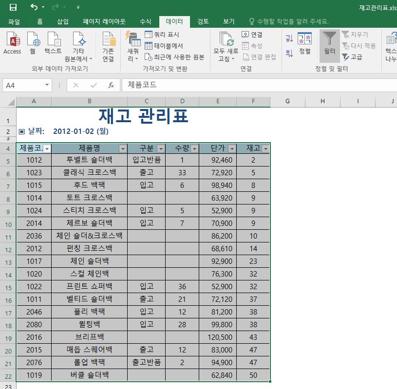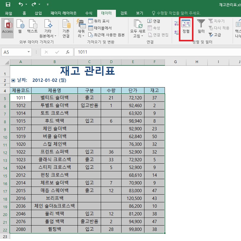 여기서 재고를 기준으로 오름차순 정렬을 해보도록 할게요. 먼저 아래 엑셀 표에서 정렬할 영역을 선택합니다. 그 다음 데이터-정렬 아이콘을 클릭해주세요.