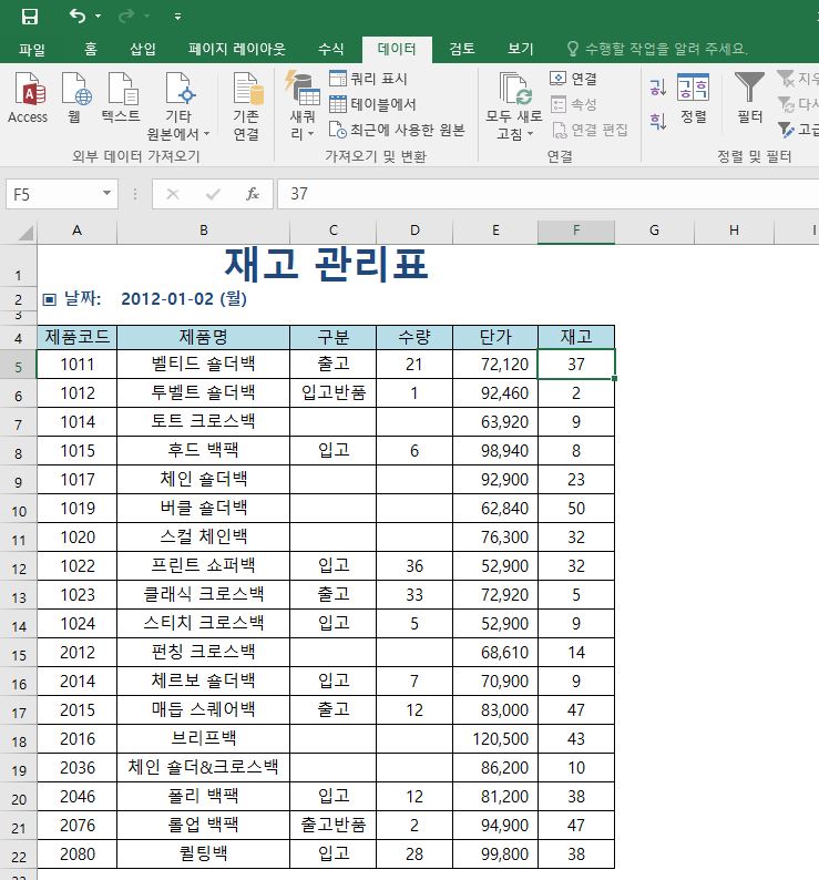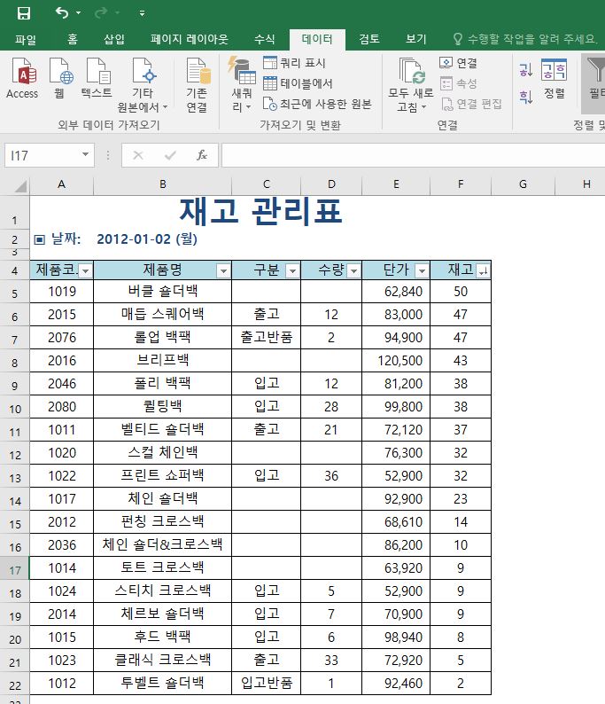 그럼 아래처럼 재고 기준으로 오름차순 정렬이 된 것을 볼 수 있습니다.