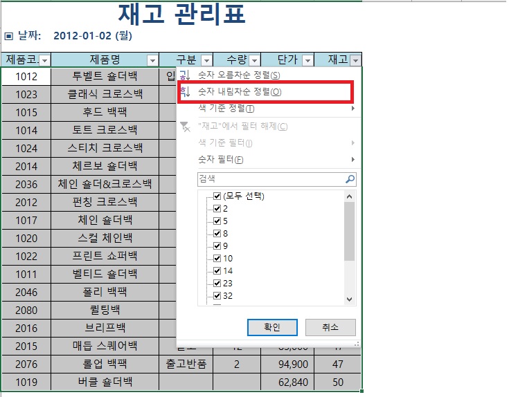 그 다음 재고 열의 아래쪽 화살표를 클릭한 다음 [숫자 내림차순 정렬]을 클릭하면 됩니다.