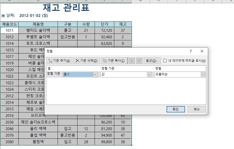 정렬 창에서 정렬 기준을 재고가 있는 F열을 선택해 주고 정렬을 오름차순으로 선택한 다음에 확인을 클릭해주세요.