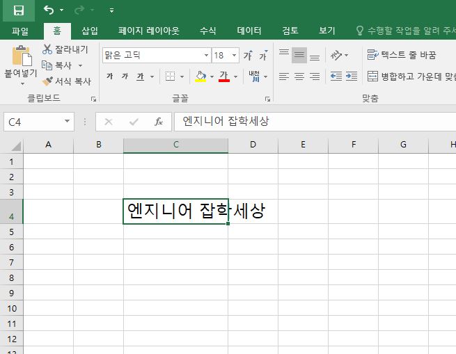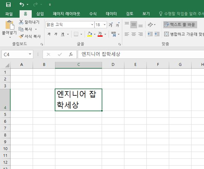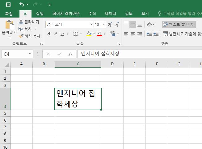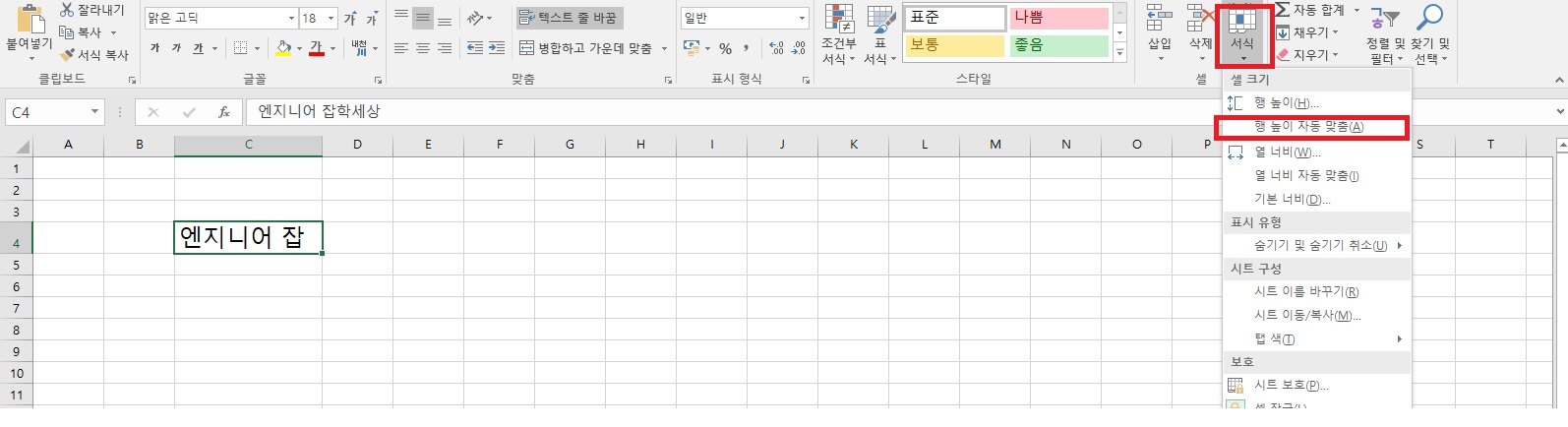 줄을 바꾸어도 셀 크기가 작아서 아래처럼 글자가 보이지 않을 경우 홈-서식-행/열 너비 자동 맞춤을 클릭하면 글자에 맞게 행이나 열 크기바 변경 됩니다.