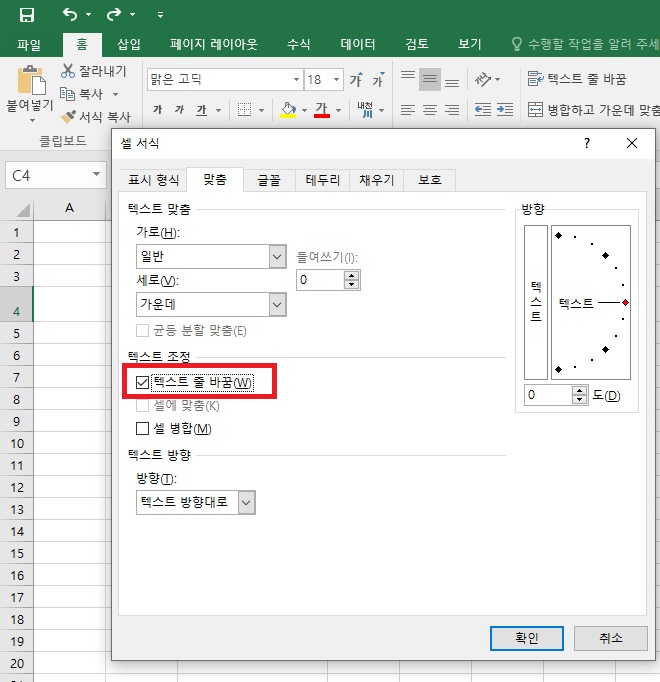 두번째 방법으로는 셀에서 오른쪽 클릭-셀 서식-맞춤-텍스트 줄 바꿈을 클릭한 다음 확인을 눌러주면 됩니다.