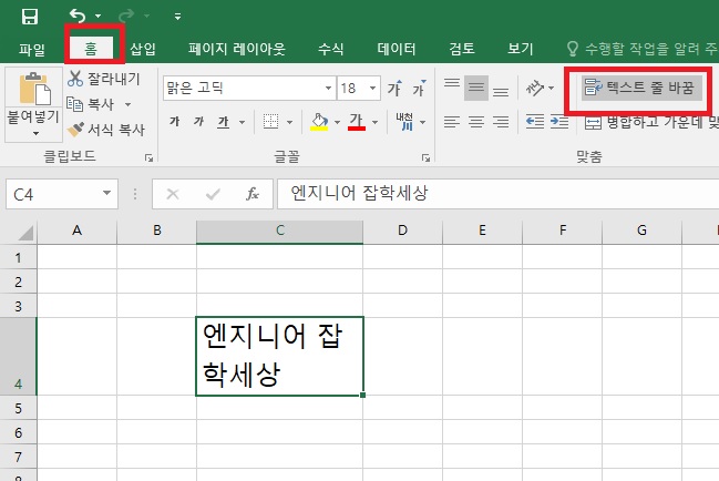 먼저 가장 간단한 방법은 셀을 선택한 다음 홈-텍스트 줄 바꿈을 클릭해서 줄을 바꾸는 것입니다.