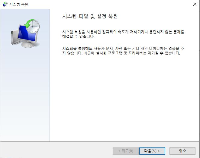 그럼 시스템 복원 창에 나오게 됩니다. 그 다음 다음을 클릭해주세요.