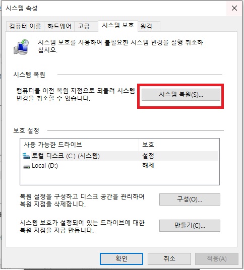 그 다음 시스템 속성 창에서 시스템 복원을 클릭해주세요.