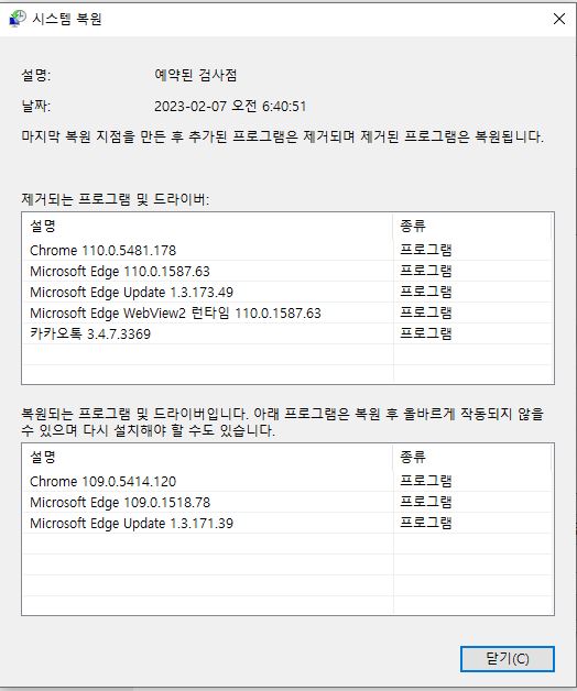 그리고 원하는 시점을 선택해주시면 됩니다. 이 때 영향을 받는 프로그램 검색을 클릭하면 어떤 프로그램이 이전과 변경이 되었는지 볼 수 있어요.