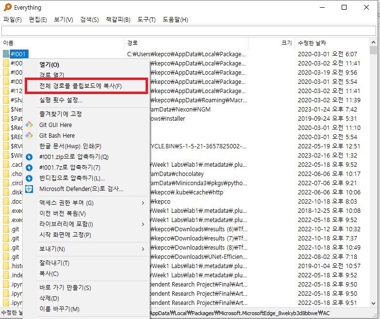 그리고 검색된 파일을 오른쪽 클릭하면 전체 경로를 클립보드에 복사 할 수 있어요. 아주 유용하고 자주 사용하는 기능이랍니다.