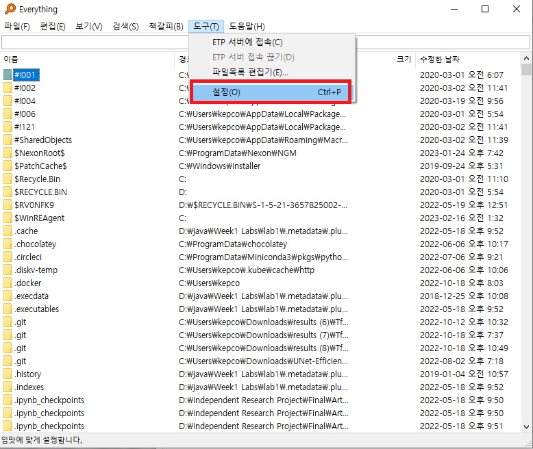 그리고 상단에 도구-설정을 들어가면 사용 중에 필요한 다양한 설정을 바꿀 수 있어요.