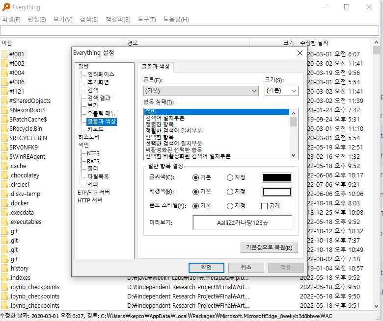 아래 이미지 처럼 글꼴과 색상 뿐만 아니라 폴더 목록, 제외 등 사용하다 보면 필요한 기능들이 있으니 본인에게 맞는 것으로 선택해서 사용하면 되요.