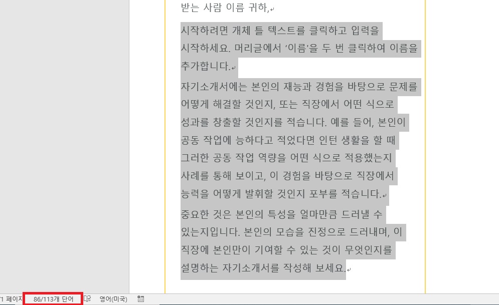 그리고 단어 개수 기능 외에도 단순히 글자수 세기를 원하는 글을 선택하면 하단 바에서 알 수 있어요.