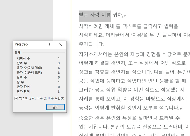 그리고 원하는 부분만 선택해서 글자수를 셀수도 있어요. 필요한 부분만 선택한 다음 [단어 개수] 를 클릭하면 되요.