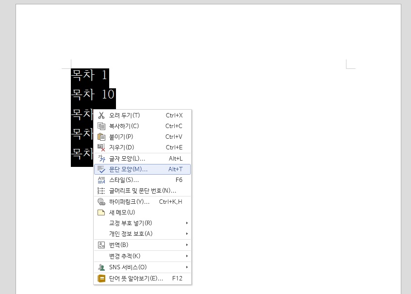 목차를 전체 선택하고 오른쪽 클릭한 다음 [문단 모양]을 클릭해주세요.