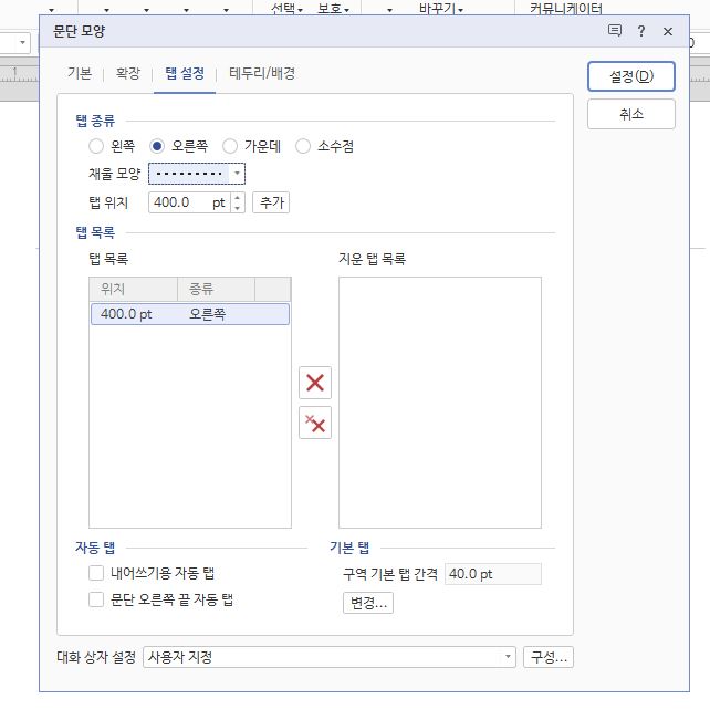 [탭 설정]을 클릭한 다음 탭 종류 오른쪽, 채울 모양은 점선을 골라주세요. 그리고 탭 위치는 400-450 사이를 적어주신 다음에 추가를 클릭해주세요. 그 다음 설정을 눌러주시면 되요.