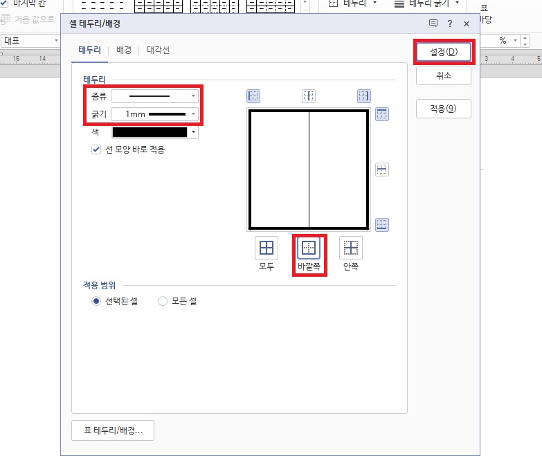 다시 셀 테두리/배경에 들어가신 다음에 종류를 실선으로 해주신 다음 굵기를 1mm로 해주세요. 1mm로 해도 충분히 두껍답니다. 그 다음 바깥쪽을 클릭해주시면 외곽 테두리를 두껍게 할 수 있어요.