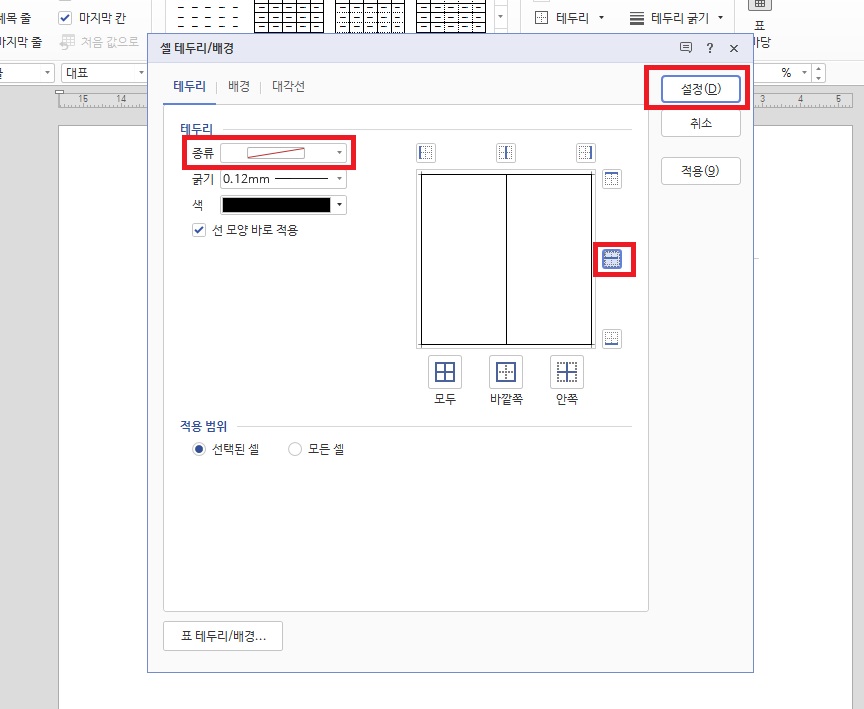 셀 테두리 종류를 없음을 해주고 가운데 줄을 선택해주신 다음 설정을 클릭해주세요. 셀의 중간 테두리를 안보이게 만든다는 의미에요.