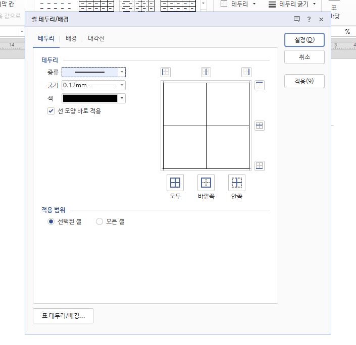 셀 테두리/배경에서 테두리를 선택하면 여기서 표 테두리를 설정할 수 있어요.