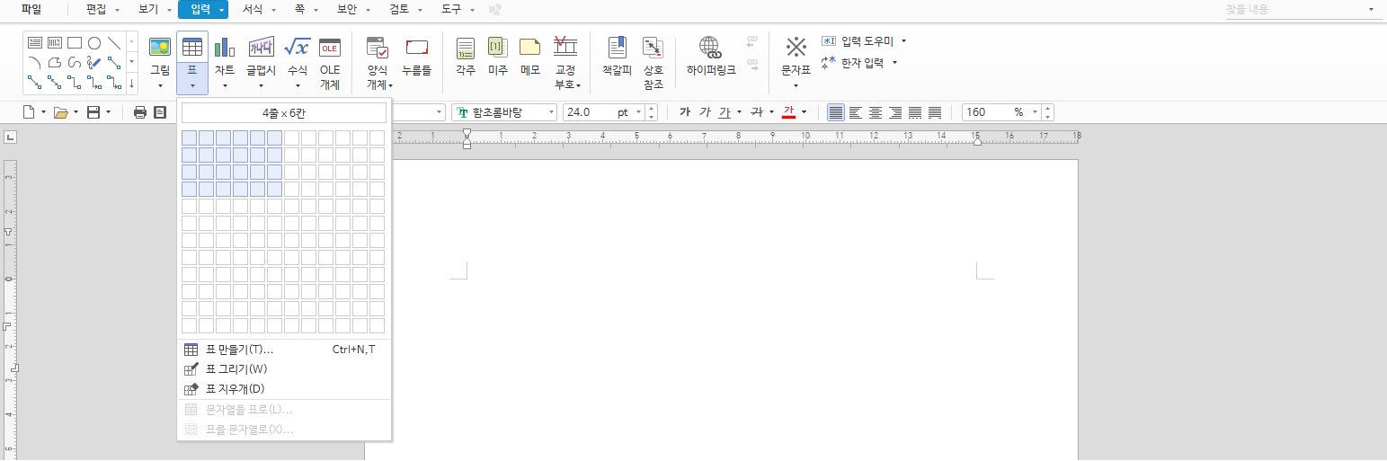 먼저 한글에서 표를 만들어 볼게요. [입력]-[표]를 선택한 다음에 원하는 줄 칸에 맞는 표를 만들어 주세요.