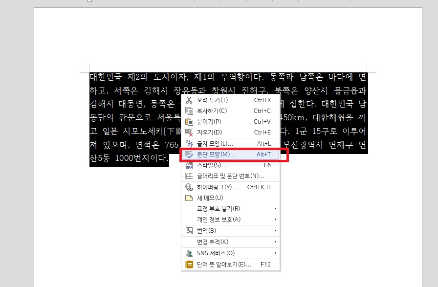 문장을 전체 선택한 다음 마우스 오른쪽 클릭하고 [문단 모양]을 클릭해주세요.