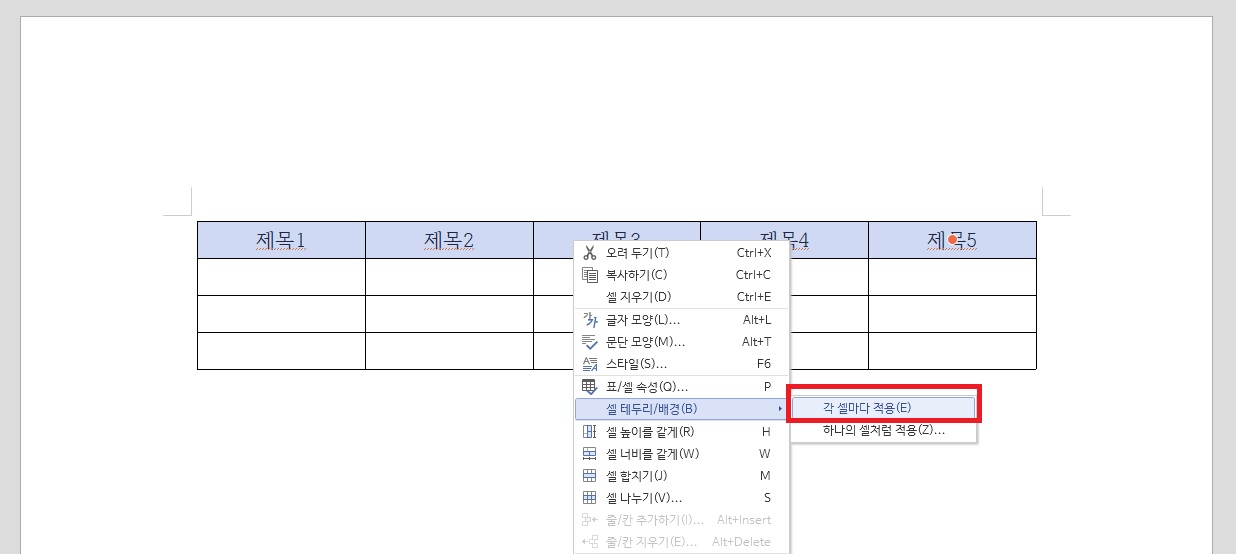 그 다음 오른쪽 클릭-셀 테두리/배경-각 셀마다 적용을 클릭해주세요. 그럼 표에서 셀에 대한 설정을 적용할 수 있어요.