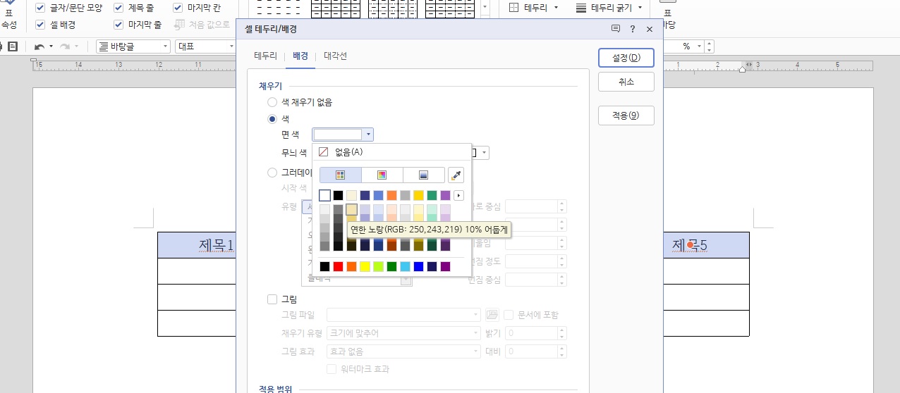 셀 테두리/배경 창에서 상단 탭의 배경을 클릭한 다음 색에서 면 색을 클릭하여 원하는 색을 선택한 다음 설정을 클릭해주시면 되요.