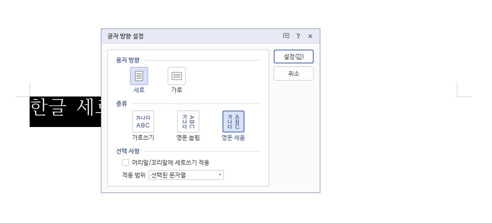 그 다음 영문 세움을 선택하면 됩니다. 이때 용지 방향을 바꾸거나 적용 범위도 여기서 변경할 수 있으니 필요한 설정을 바꿔서 만들어주면 되요.