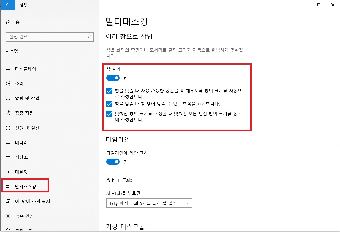 시스템에서 왼쪽 메뉴에 멀티태스킹을 클릭한 다음에 여러 창으로 작업의 체크박스 3개와 창 끌기를 켬으로 해주시면 되요. 그럼 화면 분할하는 기본 설정이 완료되었습니다.
