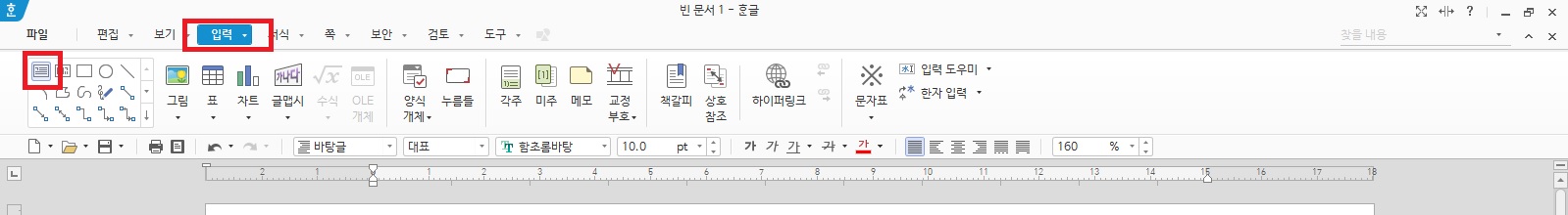 상단 메뉴에서 입력을 클릭하고 표시된 것을 클릭한 다음에 원하는 위치에 마우스 클릭을 해주거나 드래그 앤 드롭을 하면 원하는 크기의 글 상자를 만들 수 있어요,