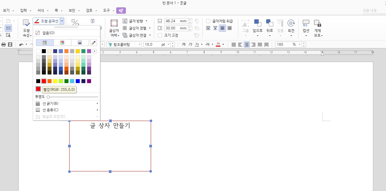 글 상자 윤곽선과 내부 색 채우기도 할 수 있어요. 원하는 모양의 글 상자를 이쁘게 만들어서 문서의 퀄리티를 높이면 된답니다. 이 외에도 글상자 그림자 만들기 등 다양하게 꾸밀 수 있으니 표로 만드는 것보다 활용성이 훨씬 높답니다.