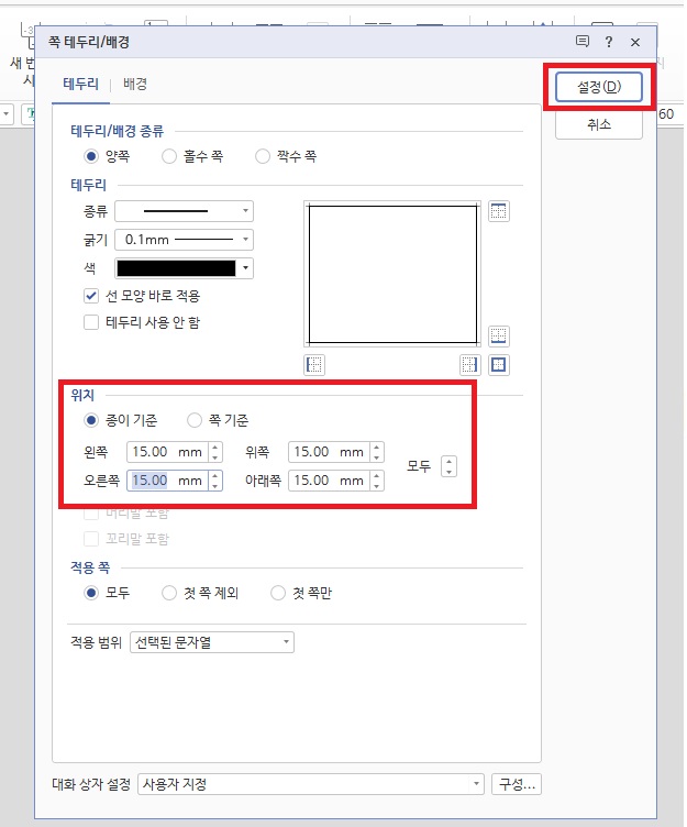 그 다음 테두리 탭에서 양쪽을 클릭하고 테두리 종류, 굵기, 색을 골라주세요. 그 다음 테두리 모든 쪽을 클릭해주시고, 위치에서 종이 기준을 클릭해주신 다음에 설정을 눌러주세요.