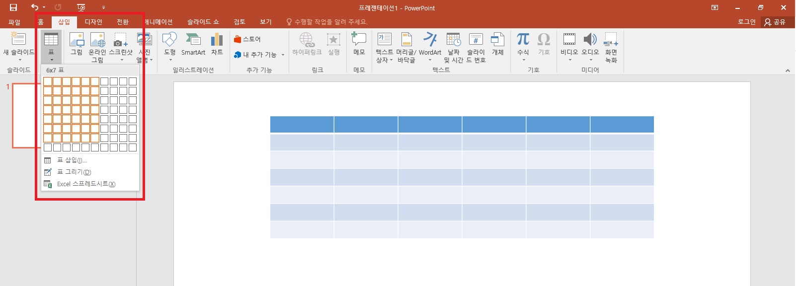 먼저 파워포인트에서 표를 만들어주세요. 표는 상단 메뉴 삽입-표를 클릭한 후 원하는 행/열의 표를 만들어 주면 됩니다.