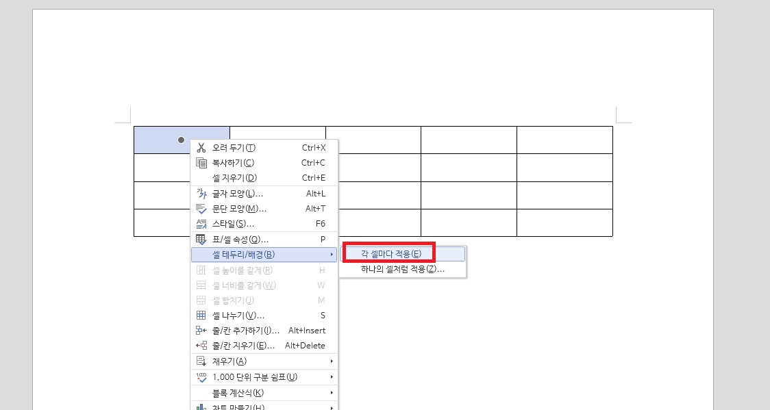대각선을 넣기 위한 표 셀에서 F5를 눌러서 선택해 주세요. 그 다음에 오른쪽 클릭-셀 테두리/배경-각 셀마다 적용을 클릭해주세요.