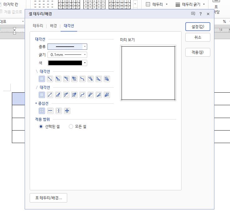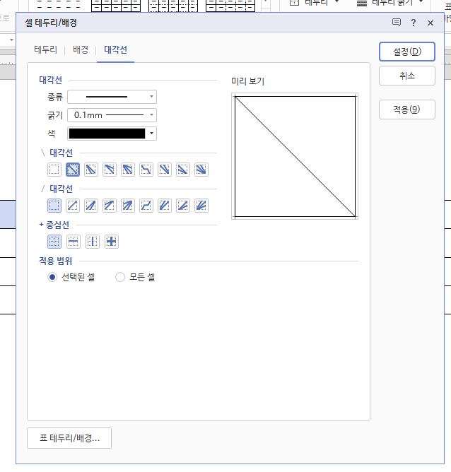 대각선을 보면 다양한 대각선 모양이 있고 원하는 것을 선택하면 됩니다. 그리고 종류/굵기/색까지 원하는 것으로 선택해준 다음 설정을 클릭해주세요.