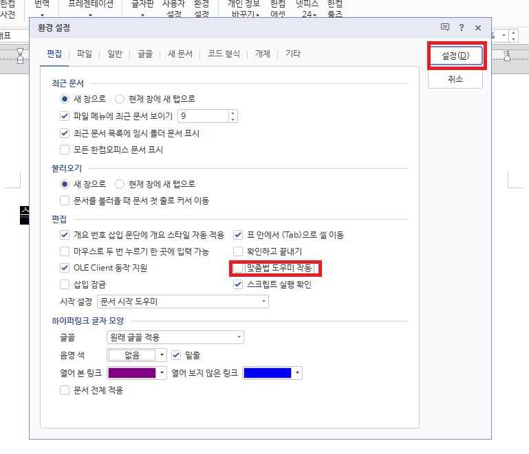 상단 편집 탭에서 맞춤법 도우미 작동의 체크를 해제하고 설정을 눌려주세요. 간혹 이 기능 때문에 한글 멈춤현상이 발생할 수도 있어서 체크 해제하는 것이 저는 좋더라구요.