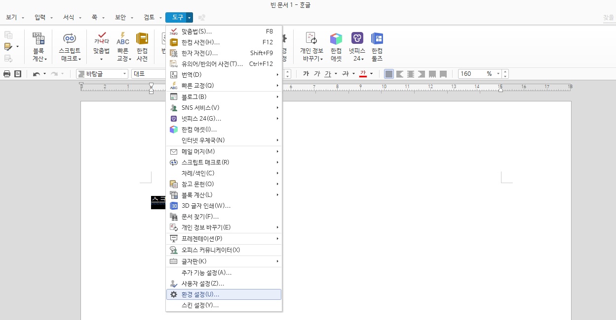 상단 메뉴 중 도구에서 환경설정을 클릭해주세요. 그럼 한글 기본 환경설정이 가능한 창이 나온답니다.