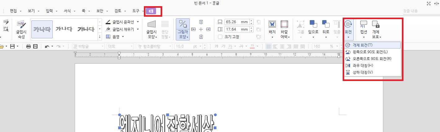 상단 메뉴 중 글맵시를 클릭하고 회전-개체 회전을 클릭해주세요. 그럼 글자를 간단하게 회전할 수 있어요.