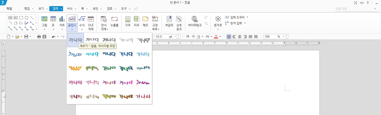 한글 글맵시를 넣을려면 상단 메뉴에서 입력-글맵시를 클릭하고 원하는 모양을 선택해주세요.