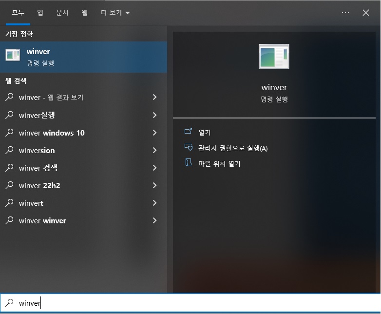 단축키 Ctrl + R을 눌러서 실행창을 이용하거나 시작에서 winver를 검색해주세요. 그럼 winver 프로그램이 나타난 것을 볼 수 있어요. 이걸 클릭해주세요.